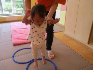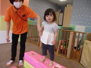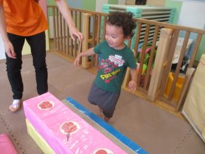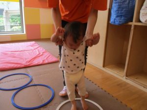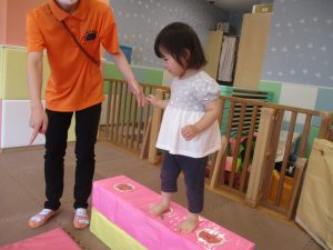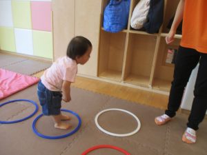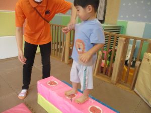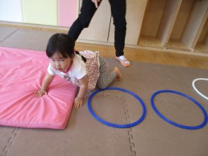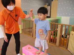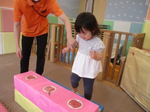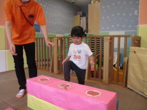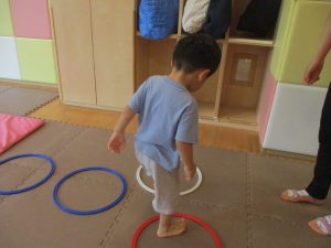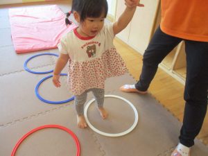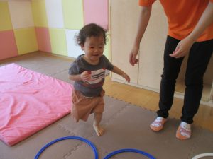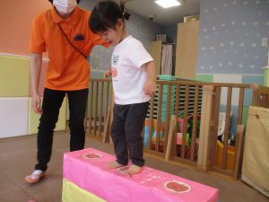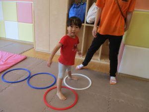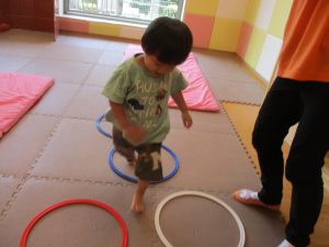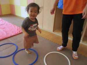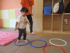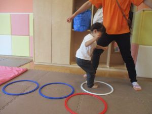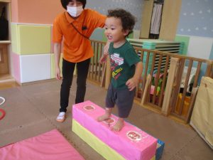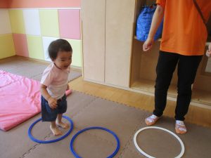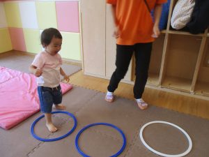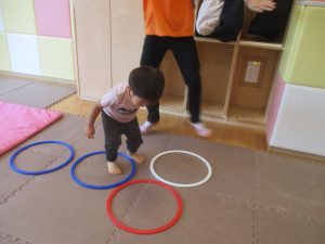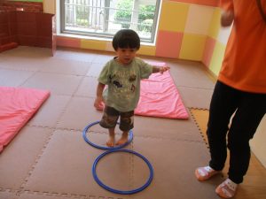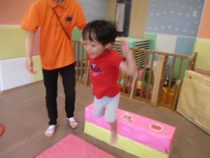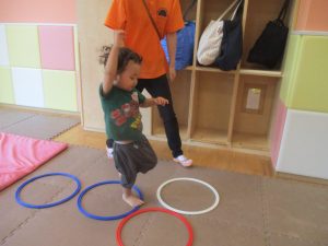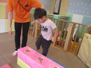 マットやボールを使った活動にも継続的に取り組みつつ、「ジャンプ」は、フープや縄、手作り積み木などの障害物を越える様々な物にもチャレンジ中でございます☆