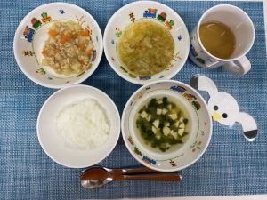 (写真は離乳食後期です。年齢によって形、固さ、盛り付け量を変えて、提供しています。)
