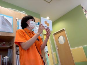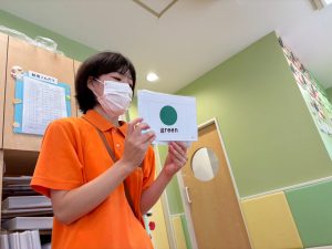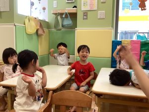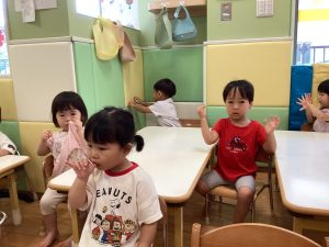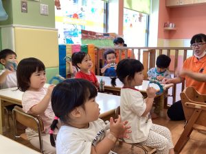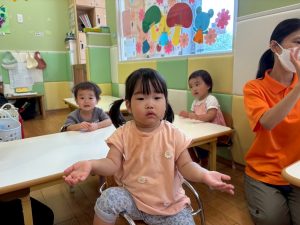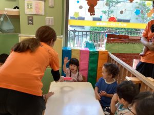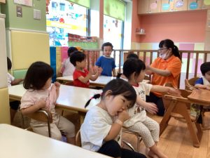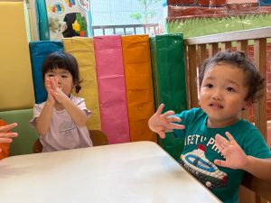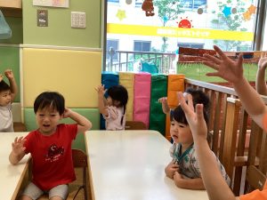 今月のリトミックでは、ハンドサインに「ファ」の音を加え、「ド」~「ソ」までを続けて覚えてみたり、”音の強弱”を感じ取れるリズム活動を行ってみたりしております。