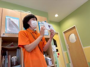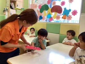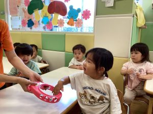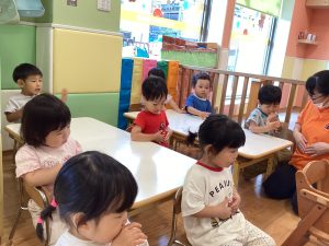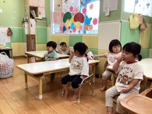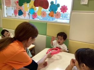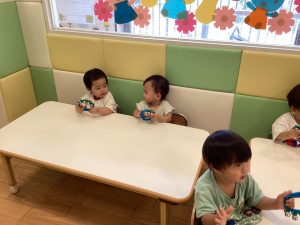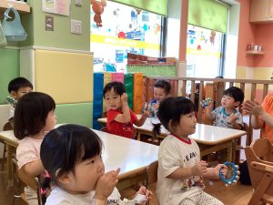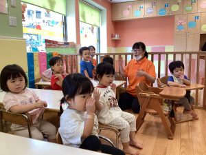 リズム活動では、「ぞうさん」や「きらきらぼし」などの簡単な童謡を使って、「大きい音」や「小さい音」の違いを感じたり、楽器を使って表現したりする活動も行っております♪