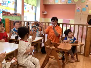 今月のリトミックでは、ハンドサインに「ファ」の音を加え、「ド」~「ソ」までを続けて覚えてみたり、”音の強弱”を感じ取れるリズム活動を行ってみたりしております。