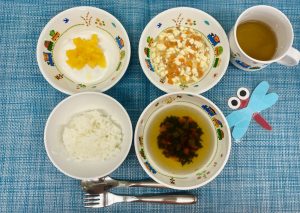 (写真は離乳食後期です。年齢によって形、固さ、盛り付け量を変えて、提供しています。)