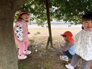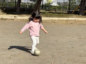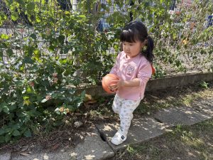 固定遊具やゴムボールを使用してたくさん体を動かしたり、ままごと遊びや自然物探しに夢中でした。