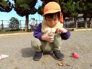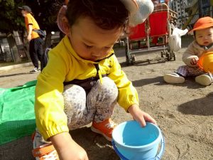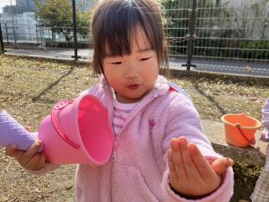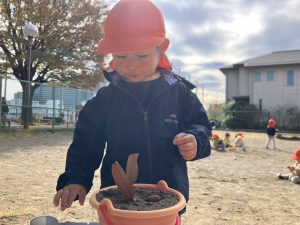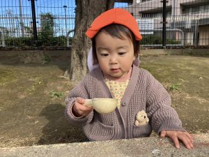 公園内で拾い集めた自然物を使用して、砂場でのままごと遊びを存分に楽しんでおりました。