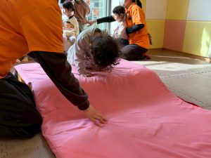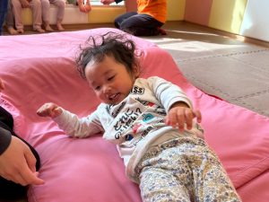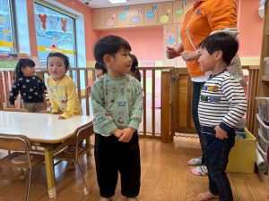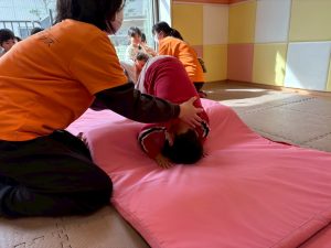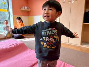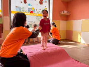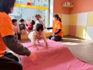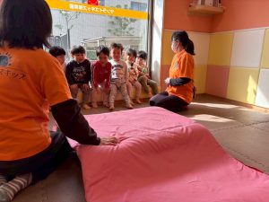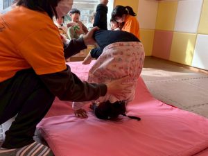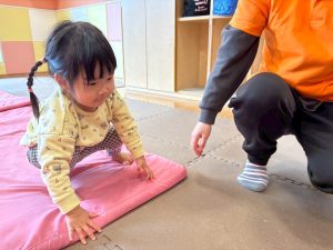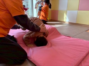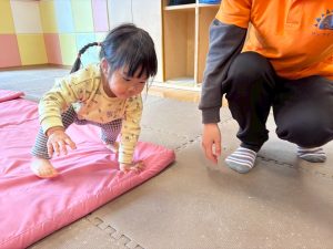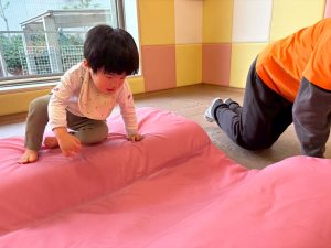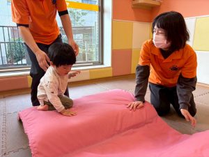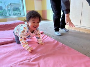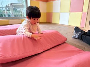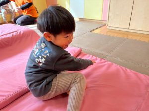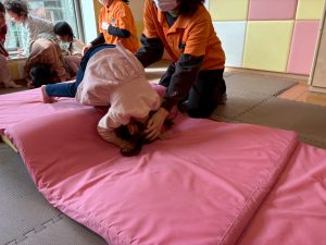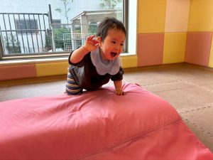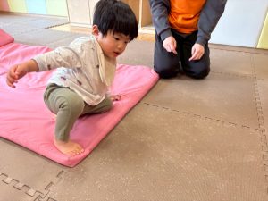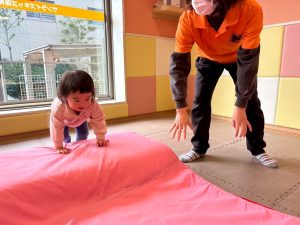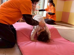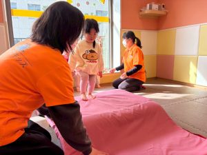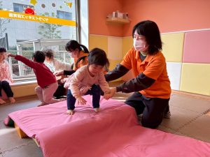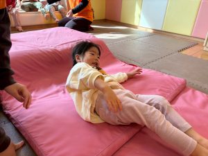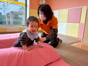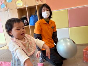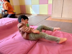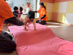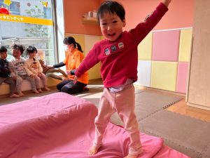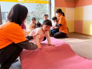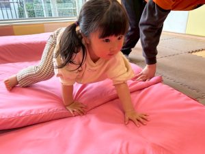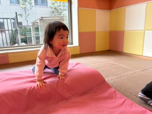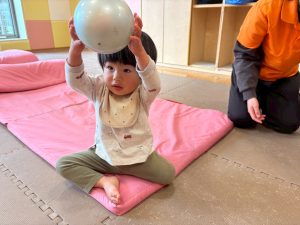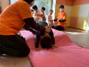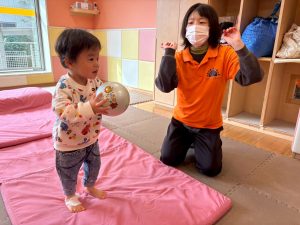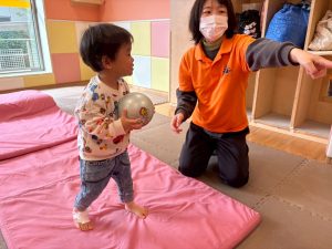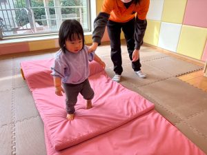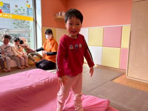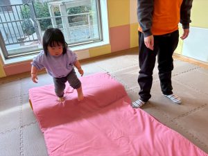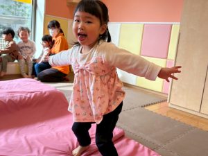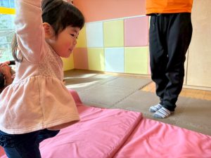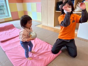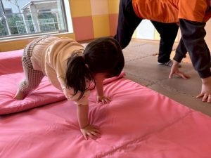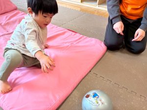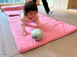 自分たちで意欲的にマット運動やボール遊びにも挑戦できるように、環境を設定。普段の保育時間や遊びの中でも取り入れたり、みんなで「〇〇ができるようになったね!」、「こんなこともできるんだね!」と褒めたり励まし合ったりして「できること」が少しずつ増えていくのを実感しながら頑張っております♪