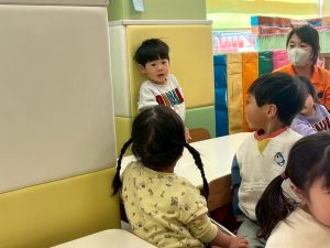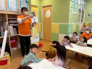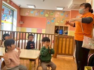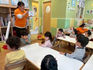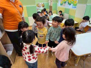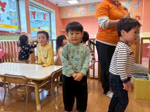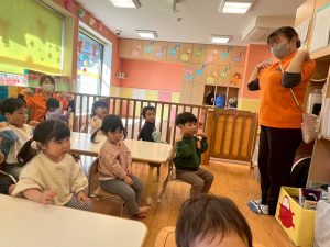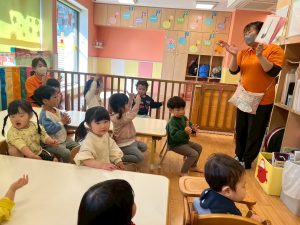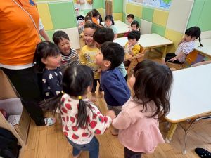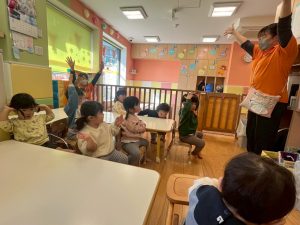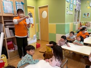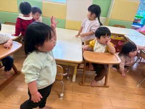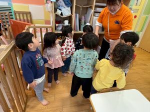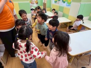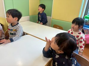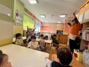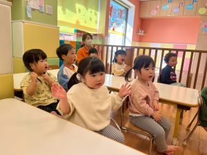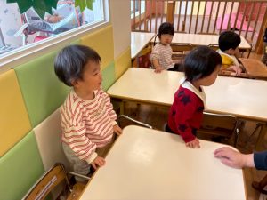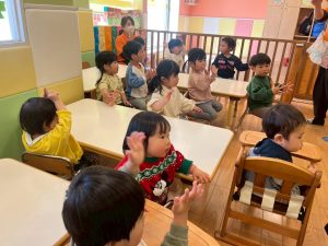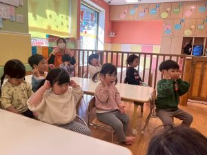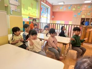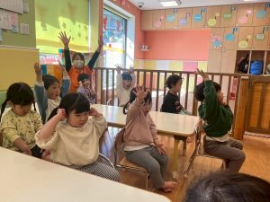 実際にみんなで体を動かしながら、「stop」「turn around」「jump」「sit down」「run」「stand up」「walk」と声に出して頭にインプット中です♪